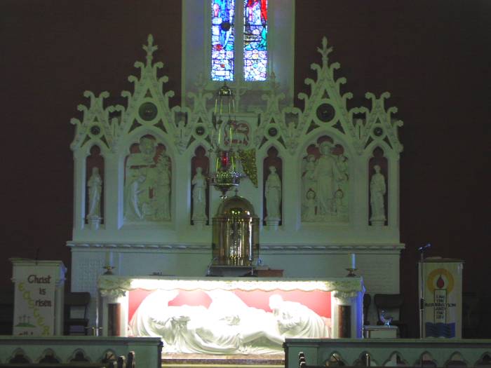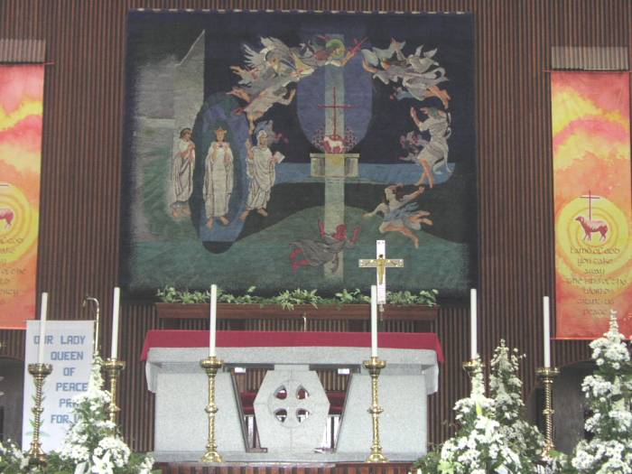 "In the center of the gable was a plain altar on which stood a lamb. Behind the lamb a large cross stood upright.