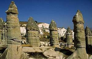 The Natural Aspect: The strange but beautiful formation of Cappadocia has had this appearance for millions of years. When the volcanoes in the region were active, the lava which poured out covered all previously formed hills and valleys forming a high plateau. This newly formed plateau consists mainly of tufa and some rare layers of basalt. This is the constructive stage of Cappadocia’s formation The destruction of the tufa and the basalt layers by erosion (heavy rains and melting snow in spring) and sharp temperature changes has continued for thousands of years and is still in process today. Wind in general has a circling effect while rivers have horizontal and rain vertical effects on the landscape. The basalt is less affected by erosion when compared to the tufa and has served as a protective cover. This juxtaposition of different materials has produced capped columns, pyramids and conical formations with dark-colored caps known as peribacalari, fairy chimneys. A block of hard rock which resists erosion is left standing alone as the tufa around it is worn away, until it stands at the top of a large cone. A fairy chimney exists until the neck of the cone is eroded and the cap falls off.